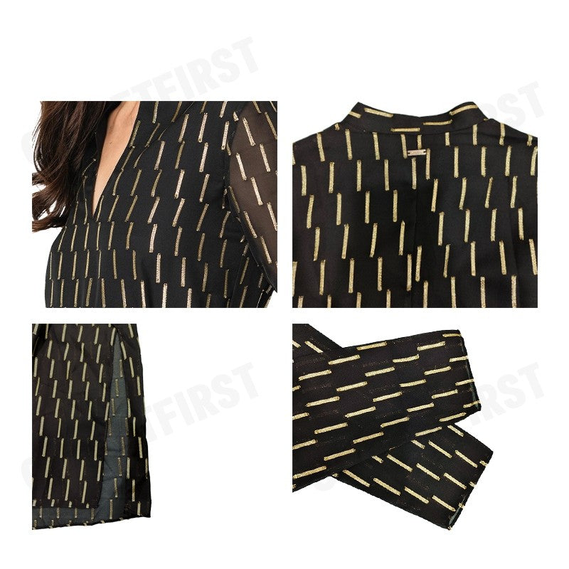 - ชุดเดรสดีไซน์กระโปรงแบบผ่าด้านข้างทั้ง 2 ข้าง และปักเลื่อมสีทอง เพิ่มความโดดเด่น