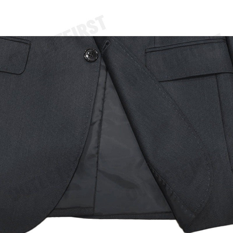 - เสื้อสูทสีเทาเข้มแต่งลายจุดสีเทาเล็กๆ ทั่วทั้งตัว